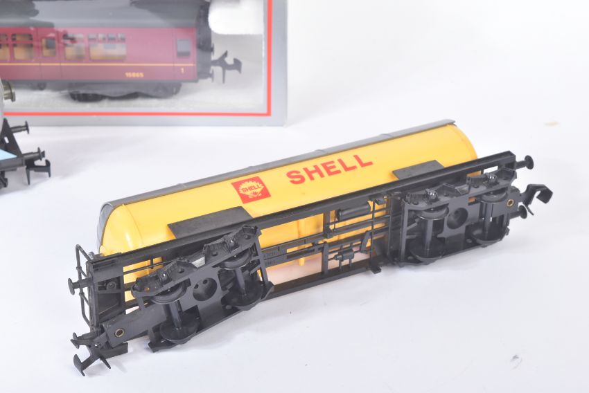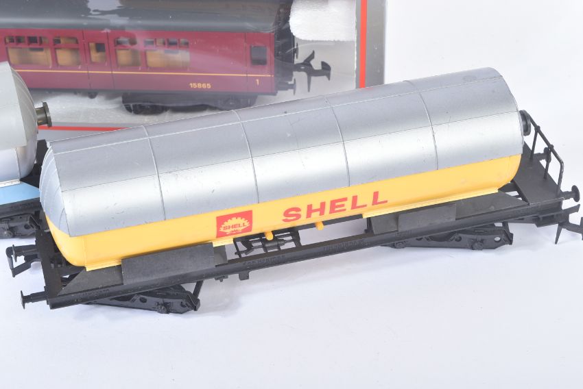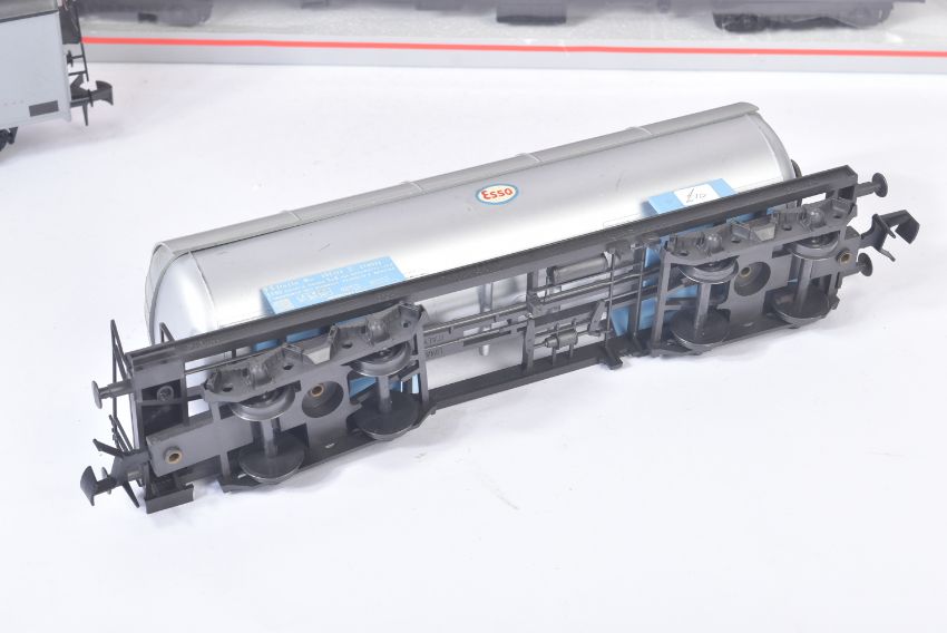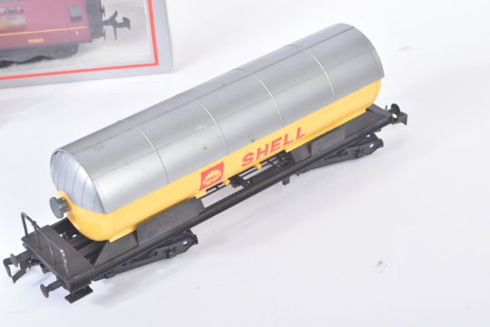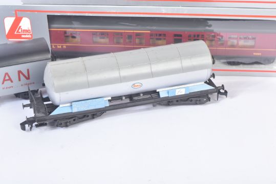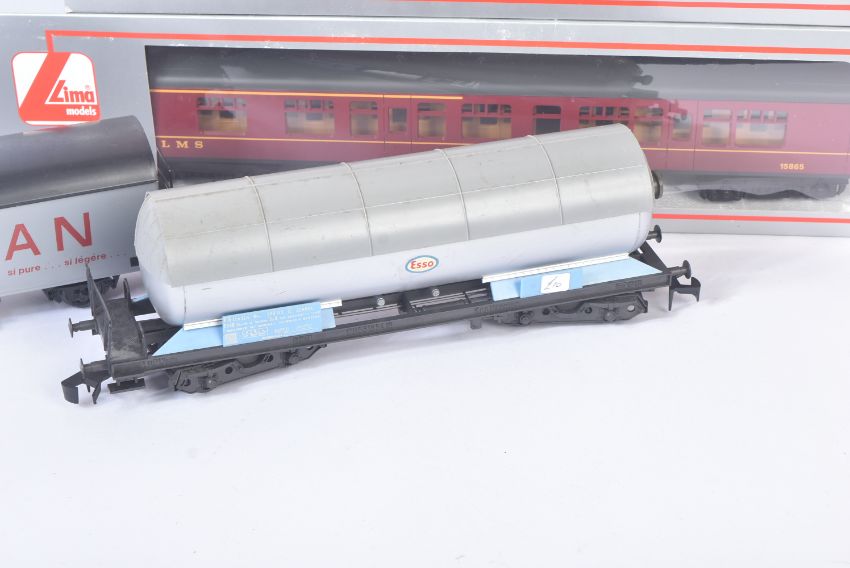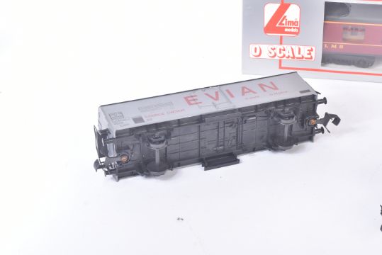 A collection of x6 Lima O gauge model railway trainset locomotive rolling stock wagons to include; Continental Bogie Tanker - Shell, Evian Water Freight Wagon, Continental Ferry Van in BR Brown and others. Boxed and unboxed examples.