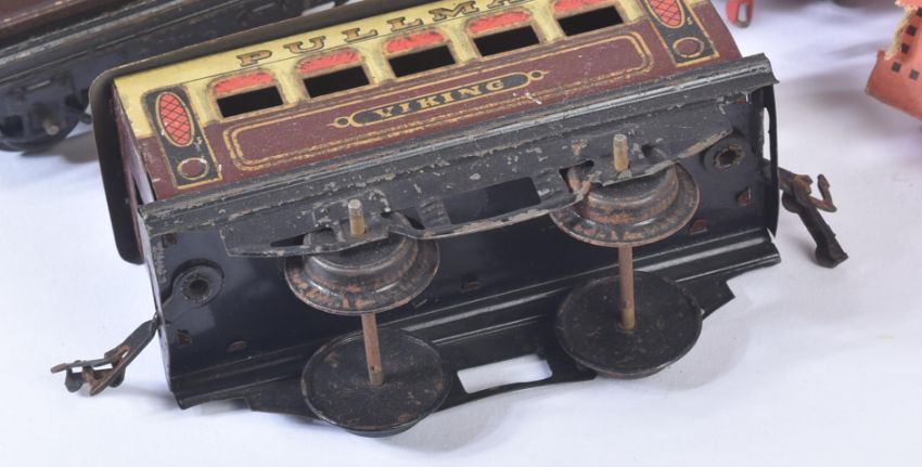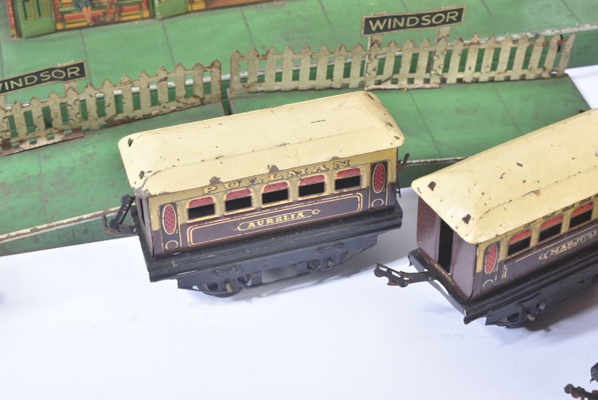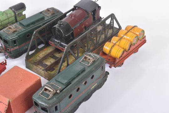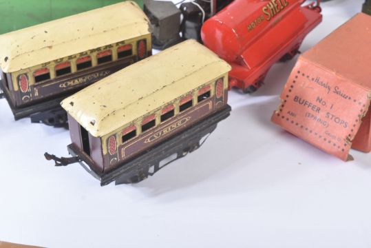 A collection of vintage O gauge tinplate clockwork model railway trainset locomotive engines, wagons and trackside accessories. Examples to include Motor Shell Spirit Wagon, Station Plaform, Waiting Room / Bookstall and more. Locos generally appearing AF / repairs.