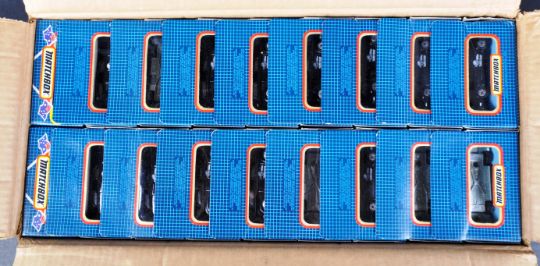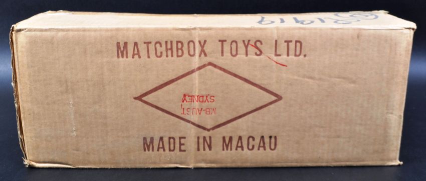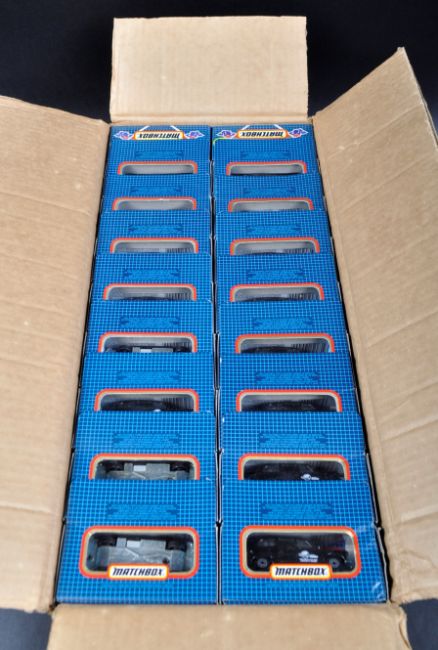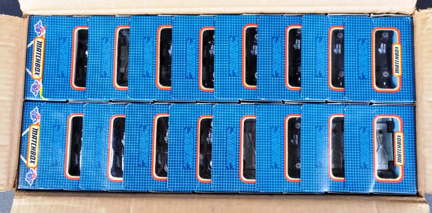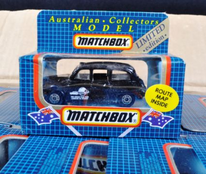 A complete box of vintage 1980s (1988) ex shop stock / trade box of Matchbox boxed diecast models, all models being MB-04 London Taxi (Limited Edition).  On the side drivers side door, badge reads “ The Great Taxi Ride London to Sydney “, route map enclosed in each box.  Contents appearing unused, boxes are unpunched, quantity of 72. Housed in original transport / trade box.