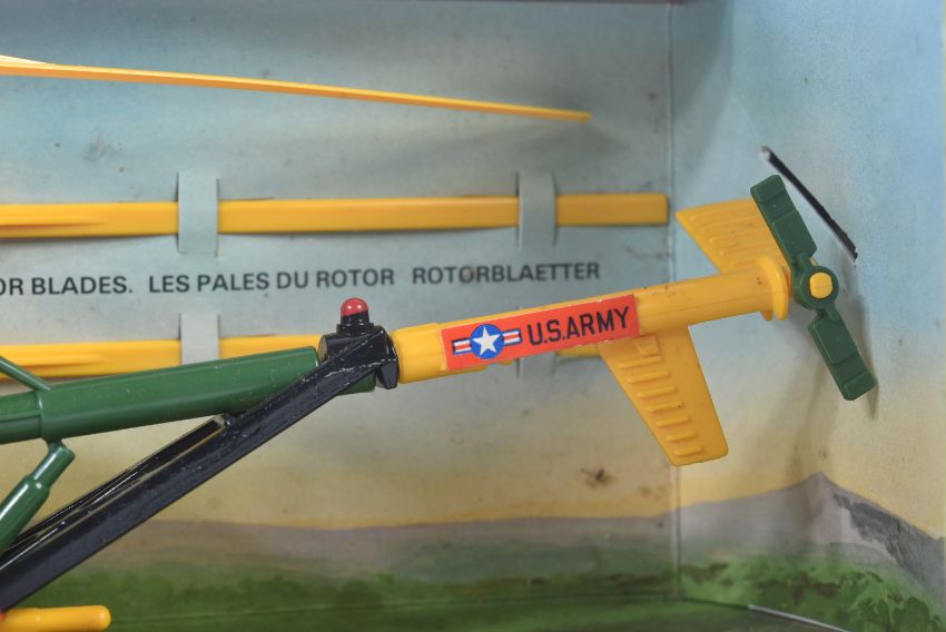 A vintage Britain's 1/32 scale diecast (and plastic parts) model No. 9761 Hughes 300C Rescue Helicopter US Army. The model with lifting winch, operating rotors (x2 attached to the inside packaging), x2 pilot figures and patient in stretcher. Housed within original box, lacking the window.