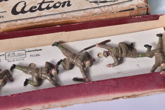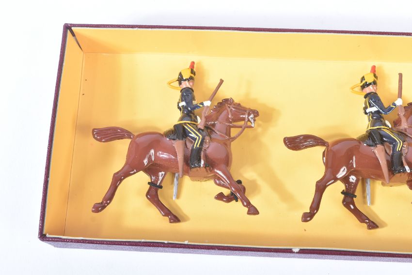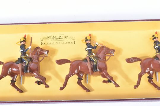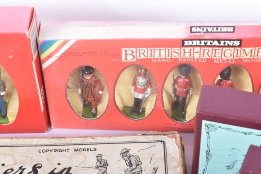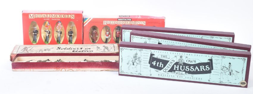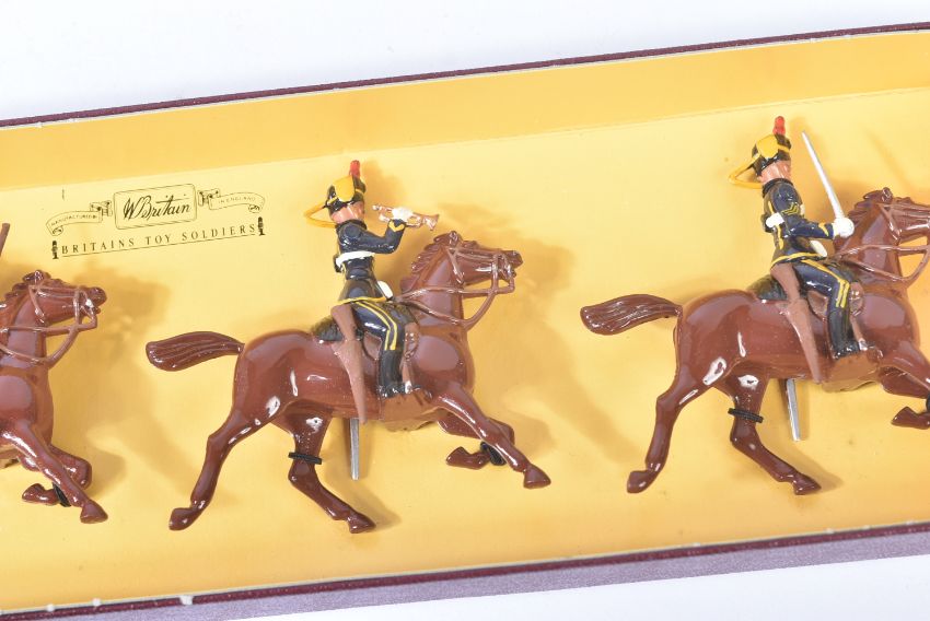 A collection of vintage Britain's lead toy soldier figurines comprising; British Infantry with gas masks, Life Guards, Yeoman of the Guard and Scots Guards, US Marine Corps and x3 boxes of The Queens Own 4th Hussars.