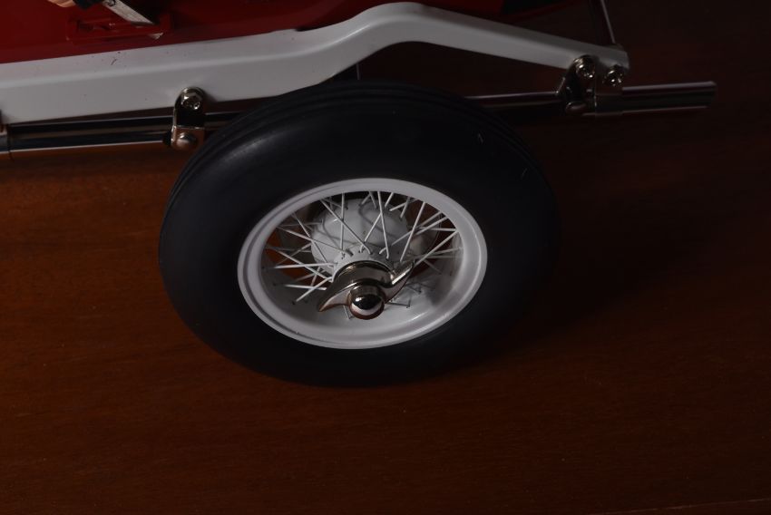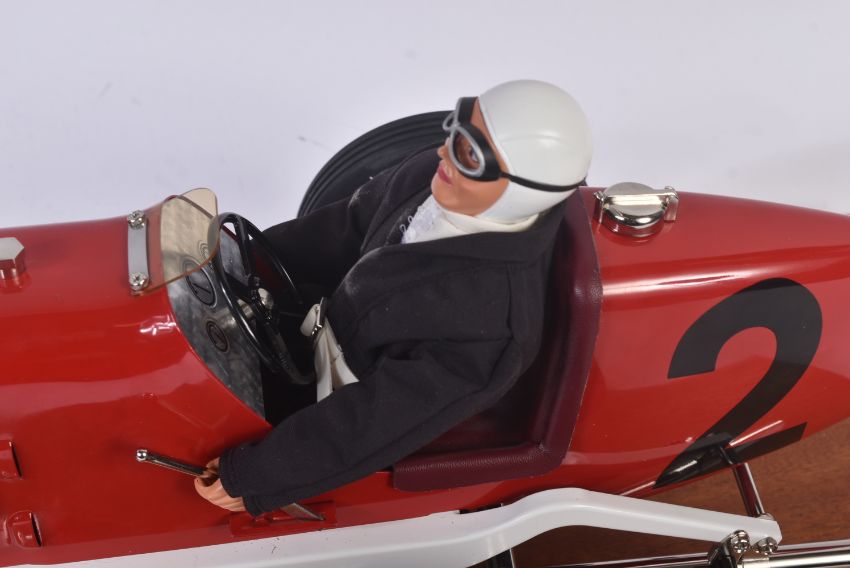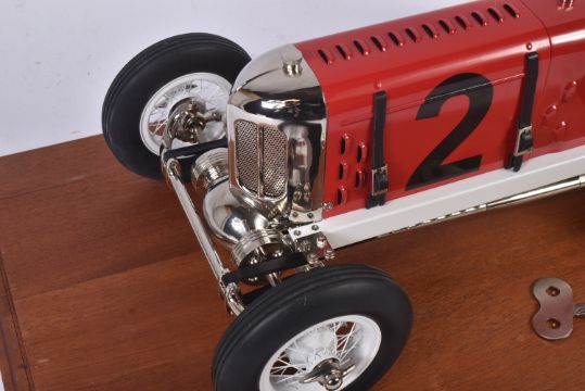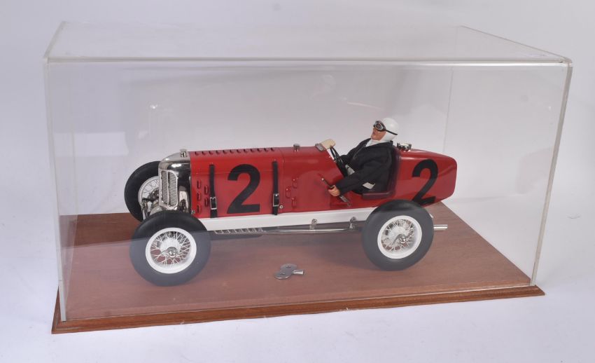 A Limited Edition Gilbow made 1/8 scale clockwork model race car of a Miller Indy race car. Diecast and tinplate construction with a clockwork motor (and key), steering, front wheel drive and removeable passenger figure. Housed in a clear perspex display case. Car measures approx. 49cm.