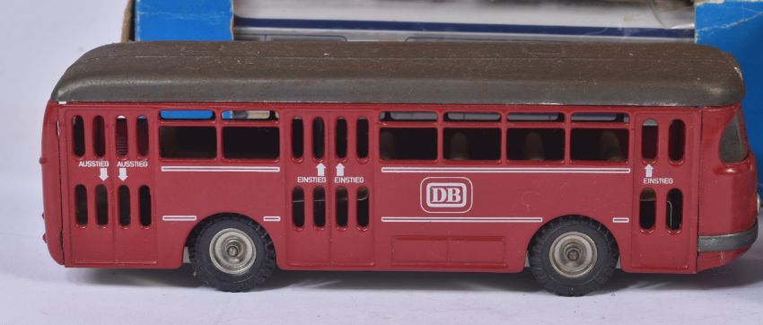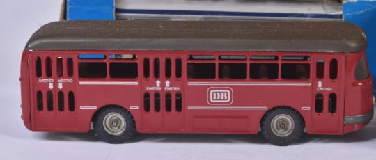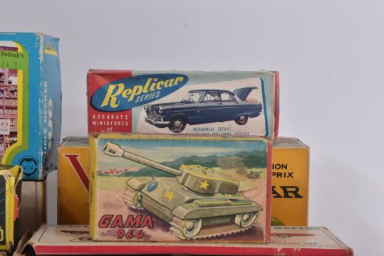 A collection of assorted vintage tinplate and friction motor models. Examples to include Ambulance Car, BOAC Coach, London Bus, Greyhound Bus and others.