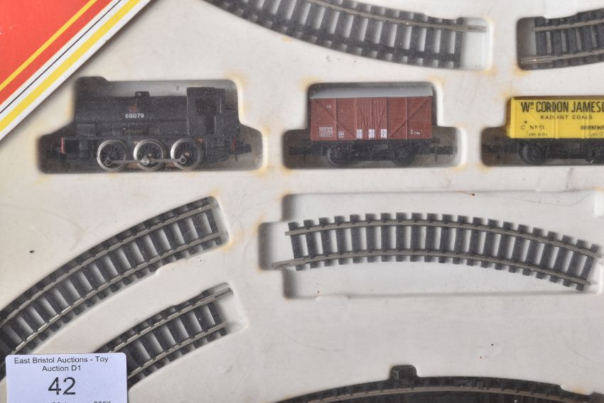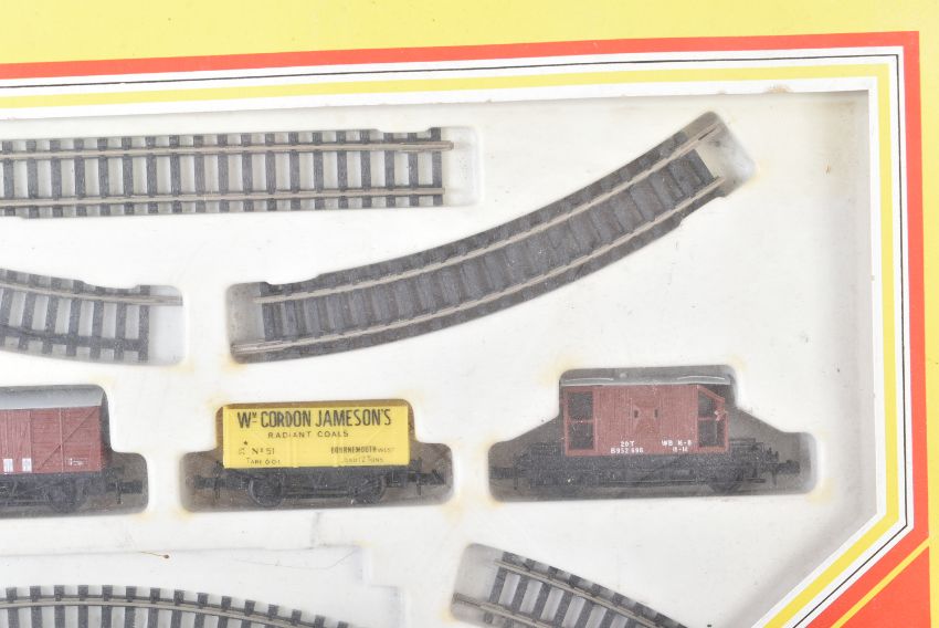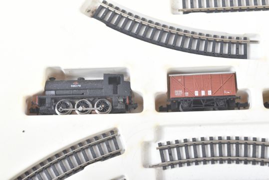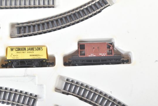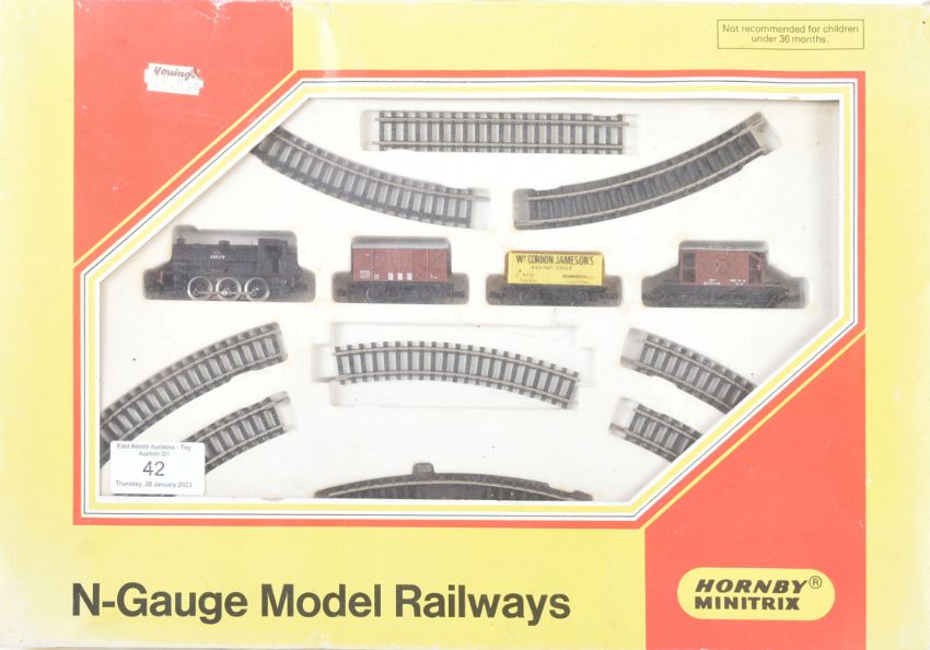 An original vintage Hornby Minitrix N gauge model railway trainset locomotive set No. 101 Goods Set. The set containing loco, x3 rolling stock wagons and a selection of track. Housed within the original box.
