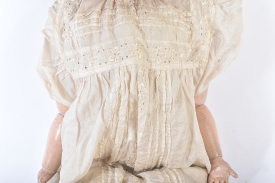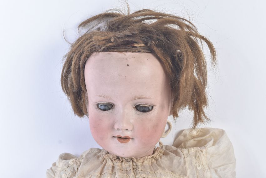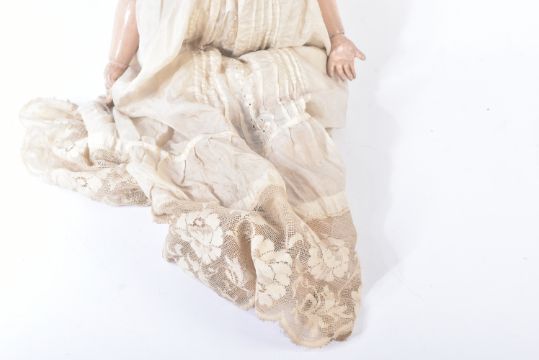 An early 20th Century German ' Armand Marseille ' bisque headed doll with leg walking mechanism. The doll with blue flirty eyes, finely painted brows and lashes and open mouth with teeth present. Marked to the back of the head Armand Marseille Germany 390 A.7.M. The composition body with wooden arms and walking mechanism operated by turning of the head. Dressed in a period war time gown, likely parachute dress. Measures approx. 60cm.