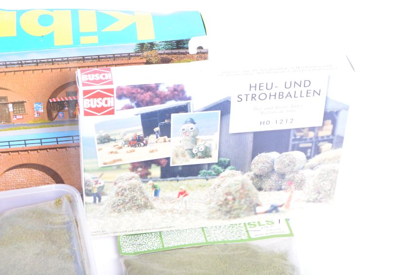 A collection of assorted 00 gauge model railway trainset locomotive rolling stock wagons and trackside accessories. Examples to include; Triang / Tri-ang Operating Mail Coach set, Kibri HO gauge model kit No. 9648 Viaduct Bridge, Woodland Foliage / Trees / Bushes / Passenger figures / Workmen and others.