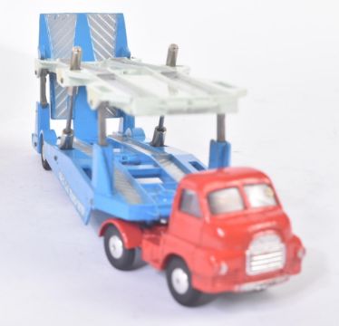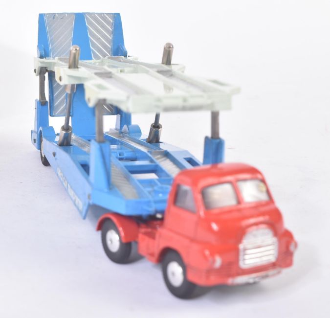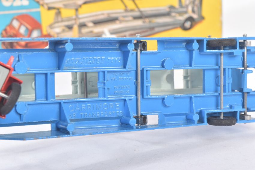 An original vintage Corgi Major Toys boxed diecast model No. 1101 Carrimore Car Transporter. The model with a red Big Bedford Track Unit cab and blue hydraulic car transporter appearing VG+ within a good original box.