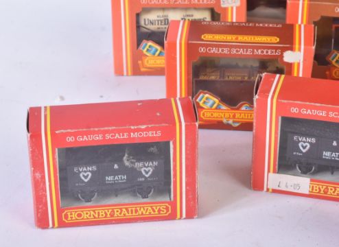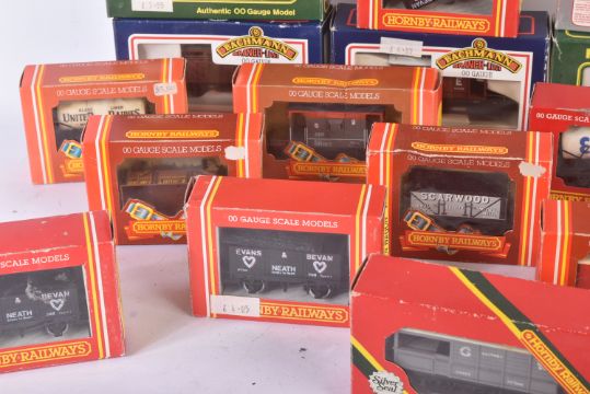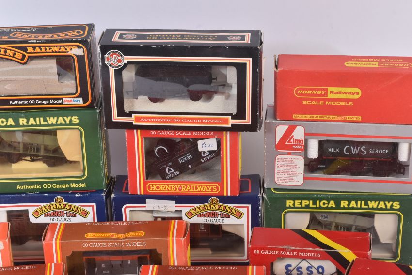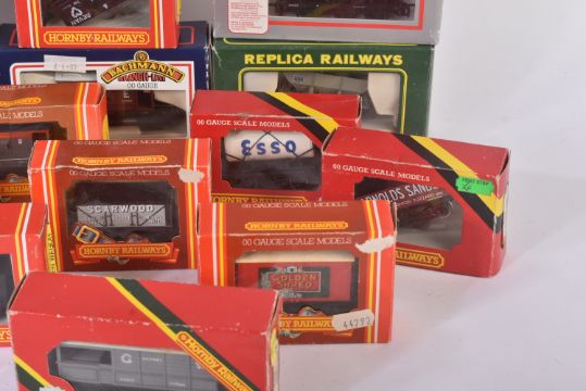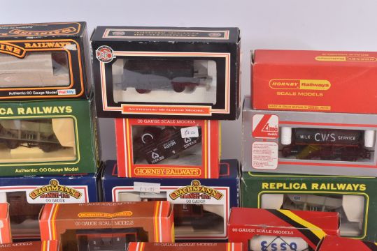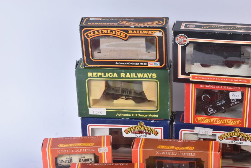 A collection of assorted OO gauge model railway trainset locomotive rolling stock wagons. Boxed examples to include; Hornby United Dairies Milk Tank Wagon, Replica Railways 24 Ton Hopper Wagon, Bachmann 20 Ton Brake Van and others. All boxed examples.