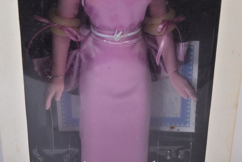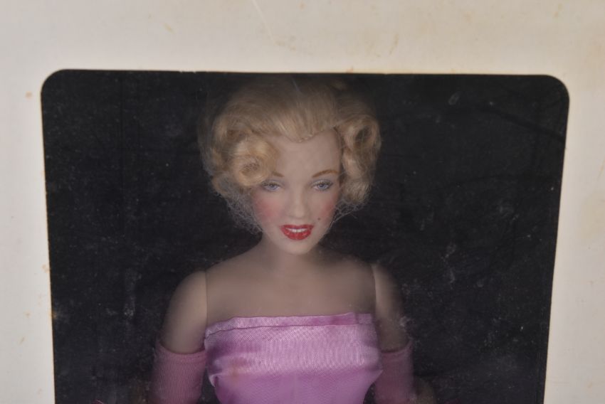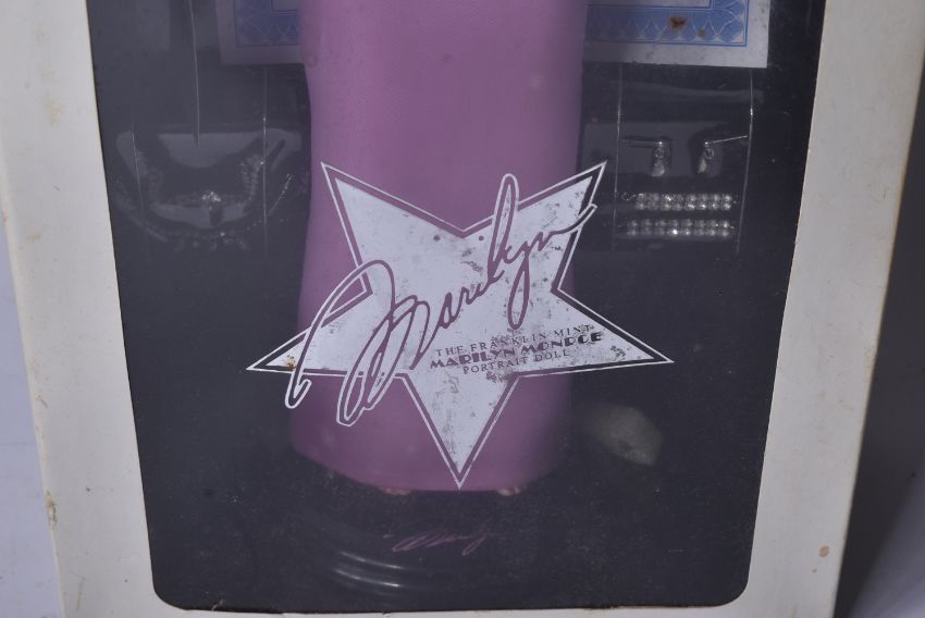 A Franklin Mint made Marilyn Monroe portrait doll. The porcelain doll with pink satin dress, hand painted features and jewellery accessories. Still attached to inner packaging within the original box with certificate. Doll measures approx. 40cm.