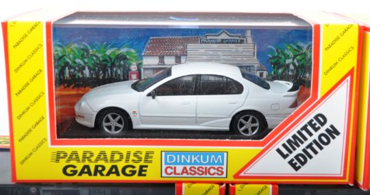 A collection of 5x assorted Dinkum Classics 1/43 scale diecast model Paradise Garage cars to include; 2 x Ford Falcon AU XR6 Limited Edition, Holden Commodore Berlina VS, Ford Falcon AU XR8, Holden Commodore Acclaim VR.  All appear mint in their original boxes.