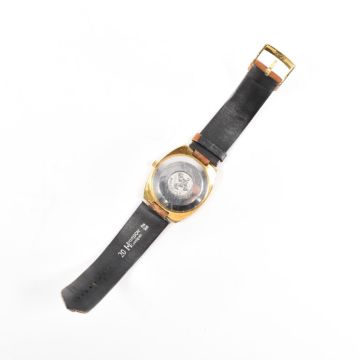 An Omega seamaster automatic stainless steel wrist watch. The watch having a round gold tone dial with gilt baton markers & fils hands with day of the week & date aperture to three, in a rounded rectangular case with Omega symbol to crown on a brown / tan leatherette strap. Total weight approx 51.3g. Measures approx 25cm. Case including crown measures approx 3.7cm. Together with red leatherette Omega box.
