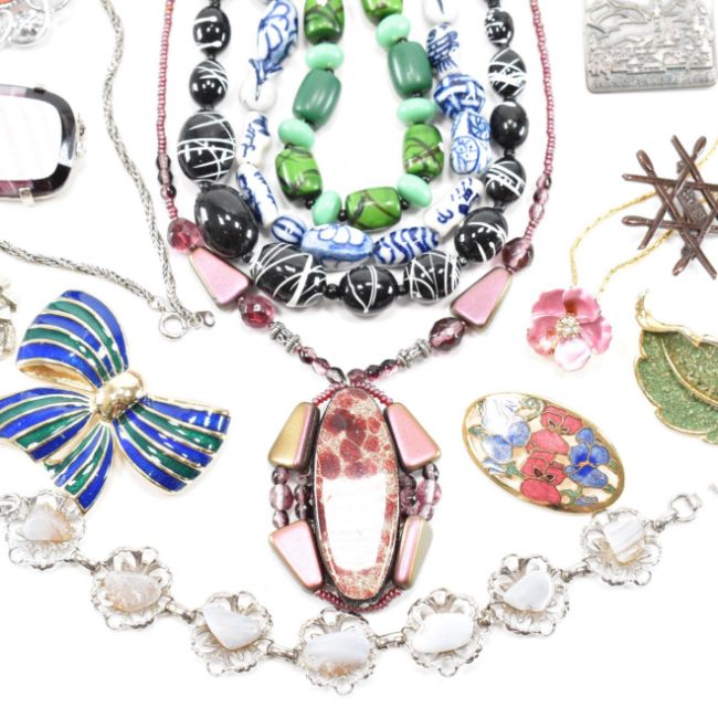 An assorted collection of vintage & later costume jewellery. The lot to include; cufflinks, necklaces, brooches, clip on earrings, demi parure, Timex wrist watch, beads, fused glass, ceramic, dutch interest beaded necklace, enamel, various coloured stones, gold tone metal, silver tone metal, cloisonne, floral, chains, bracelet, mother of pearl, charms, stick pins, tie clip, abalone, horoscope / zodiac, jewellery boxes & more. Various sizes. Total weight excluding boxes approx 472g.