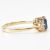 A hallmarked 9ct gold synthetic sapphire and cubic zirconia CZ three stone ring. The ring set with a step cut  synthetic sapphire flanked by two round brilliant cut  CZ to plain shank. Weight 2.4g. Size P.