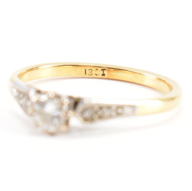 An 18ct yellow gold & diamond engagement style ring. The ring having a central round brilliant cut diamond to pinched cathedral shoulders set with further accent diamonds on a tapered shank. Marked 18ct. Central diamond measures approx 4.1 x 4.1 x 2mm. Total weight approx 1.9g. Approx size L.5.