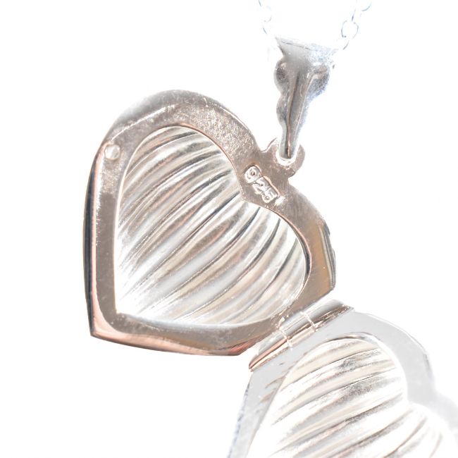 A 925 silver heart locket & chain necklace. The locket of heart form with gadrooned & brushed metal decoration with hinged opening on a cable link chain with lobster claw clasp. Marked 925. Total weight approx 6.7g. Chain measures approx 44cm, locket measures approx 3cm.