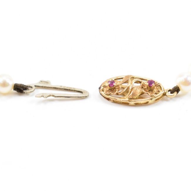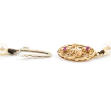 A vintage 14ct gold and cultured pearl necklace. The necklace having a string of graduating pearls with a floral clasp set with two red stones. Measures 16 inches. London import mark to clasp.