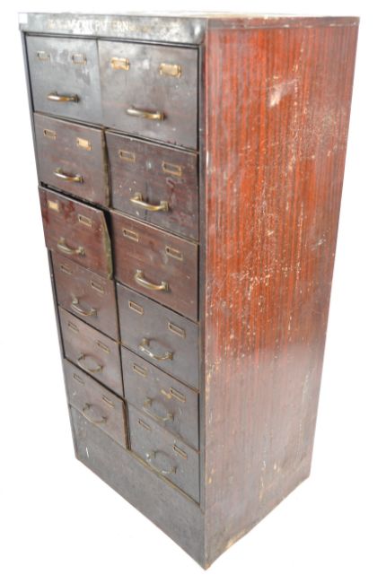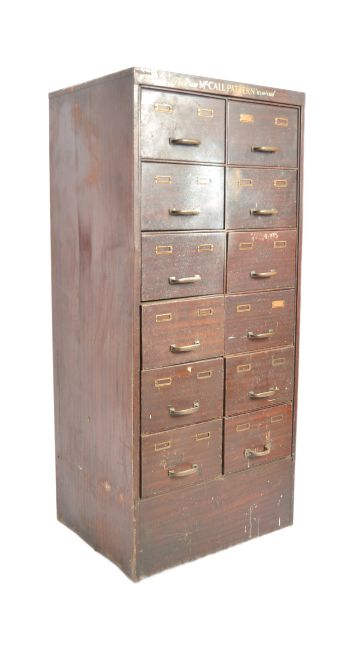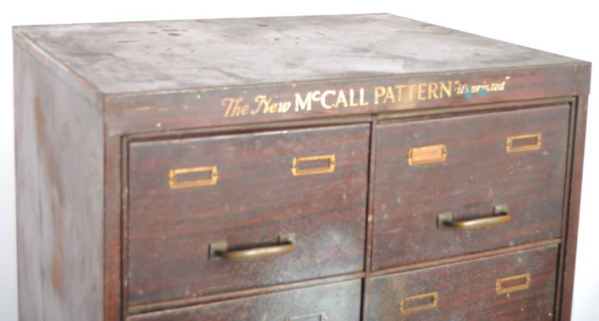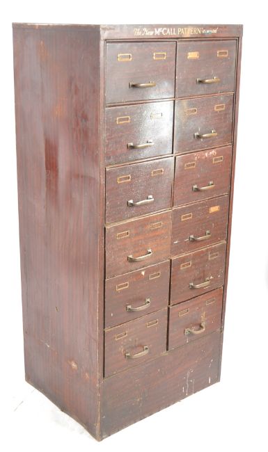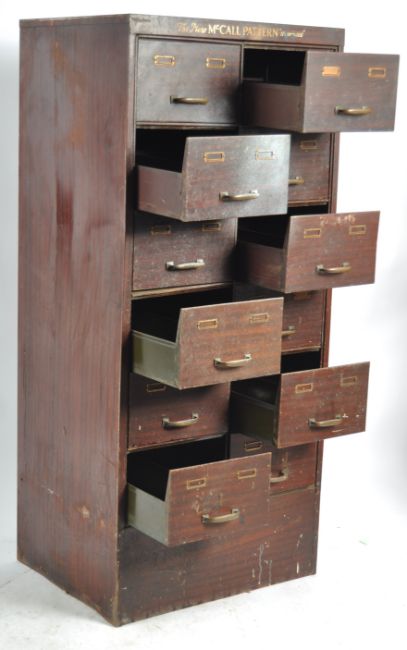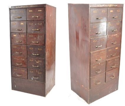 McCall - A matching pair of vintage 20th century Art Deco industrial / office filing cabinet chests of upright pedestal form. Each with dual banks of twelve drawers each with brass handles and notation slides. To the top of each cabinet stencilled "The New McCall Pattern - It's Printed". Each measures approx. 145cm x 65cm x 51cm.