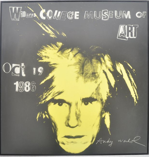 After Andy Warhol (American, 1928-1987) Williams College Museum of Art - A 20th Century offset lithograph printed in colours on woven paper, dated Oct 19 1986. Signed by Andy Warhol in silver marker to the lower right. Published by Williams College, Massachusetts. Framed and glazed. Crack to the glazing. Measures approx. 87cm x 87cm.
