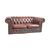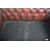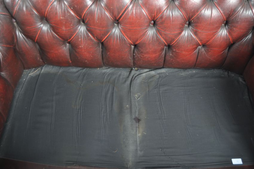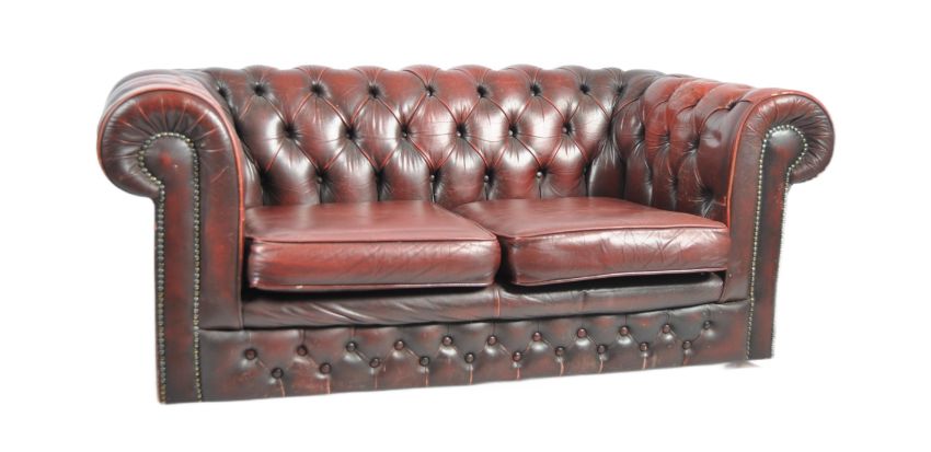 A 20th Century Victorian style Oxblood red leather Chesterfield two seater sofa settee with scrolled back and armrests with buttoned and brass stud detailing. Measures approx. 68cm x 156cm x 87cm.
