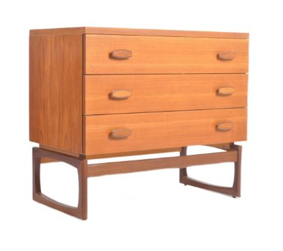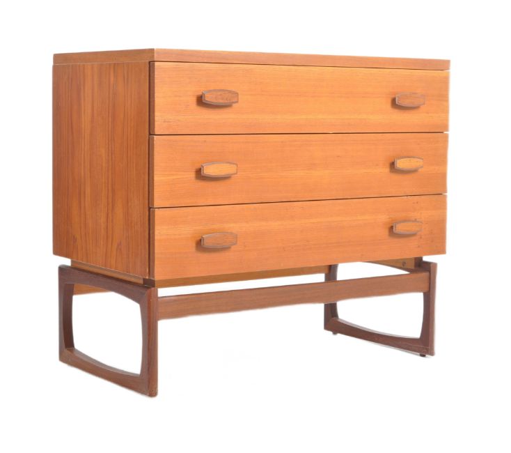 R. Bennett for G Plan - Quadrille Range - A retro 1960s teak wood chest of drawers having a bank of three drawers each with lozenge knob handles. All raised on quadrille legs. Measures approx. 72cm x 81cm x 46cm.