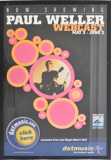 A Contemporary point of sale advertising music poster for Paul Weller Webcast with Dotmusic. Full colour printed poster set within a black frame. Measures approx. 81cm x 54cm.