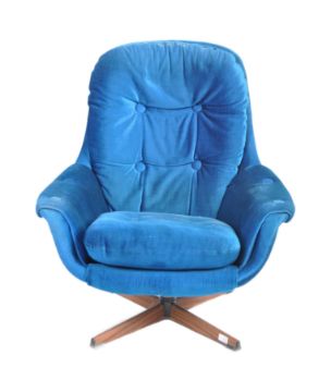 Slatte Gungan - A retro mid 20th Century Swedish egg chair / swivel lounge armchair having blue buttoned backed upholstery. All raised on faux teak four point star swivel bases. Measures approx. 95cm x 87cm x 73cm.