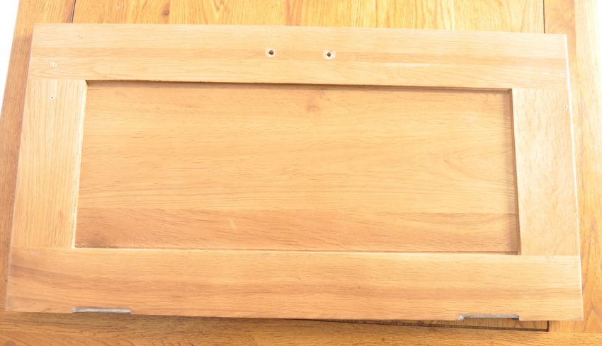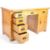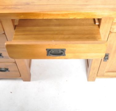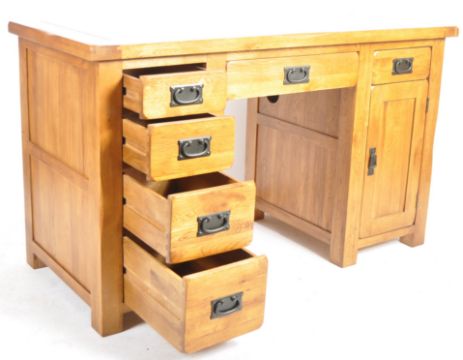 A Modern solid light oak twin pedestal office desk having a chunky oak top with central fall front section over a knee hole recess. Four graduating drawers flanking the left with a single drawer over single cupboard door. Measures approx. 80cm x 136cm x 60cm.