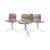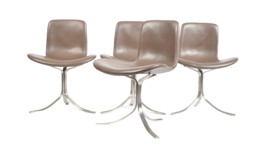 Manner of Poul Kjaerholm - PK9 - A matching set of four late 20th century designer dining chairs / side chairs having one piece sweeping back and seat rests with brown leather upholstery. Each raised on sweeping polished steel supports. Each measures approx. 80cm x 57cm x 61cm.