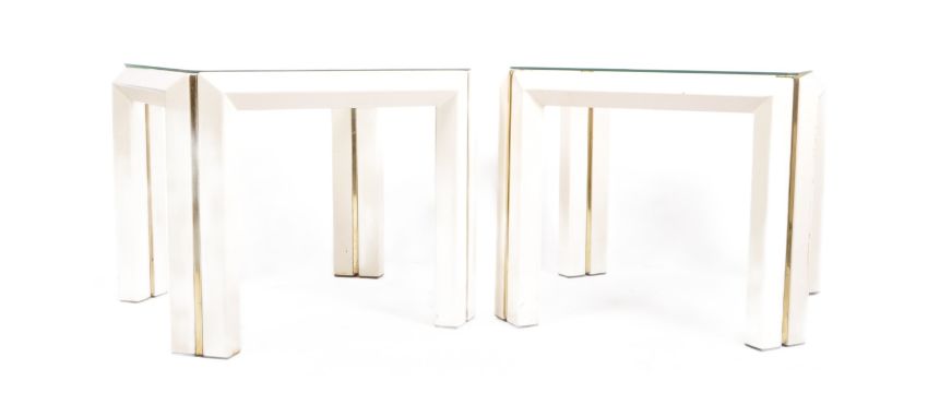 Manner of Pierre Cardin - A matching pair of retro vintage 20th Century 1980s French designer side / lamp tables / occasional tables having thick clear glass tops supported by thick cream lacquered supports with brass detailing. Each measures approx. 53cm x 64cm x 64cm.