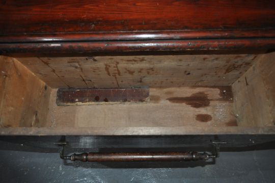 19th century Victorian mahogany shop dresser - shop haberdashery shelving unit. Raised on a plinth base with four large and deep drawers with full size large brass horizontal handles to each drawer. Above, a large and tall upright gallery back with sectional shelving and flared pediment atop. Dismantles into 2 pieces for ease of movement. Measures approx. 227cm x 181cm x 45cm.