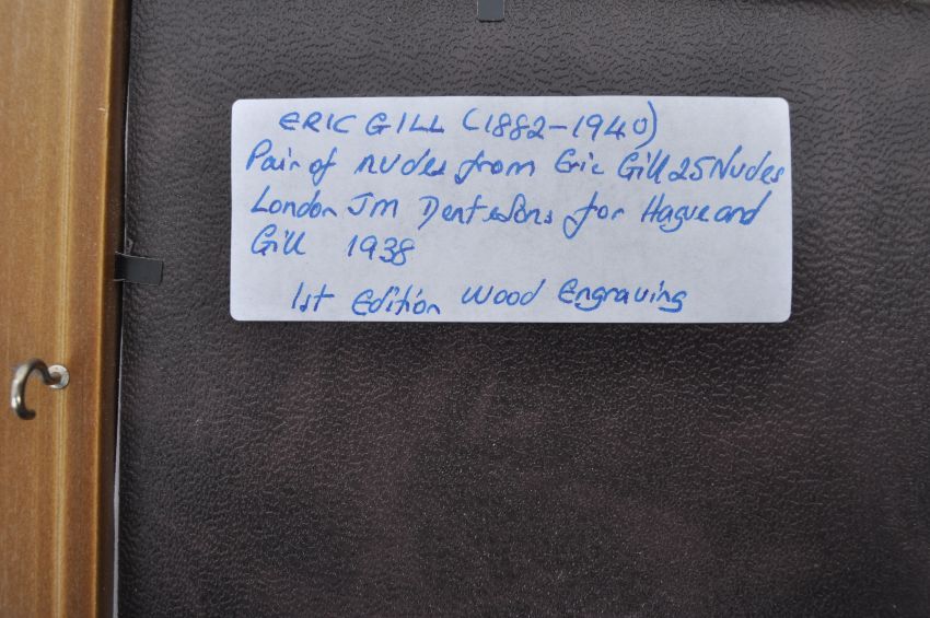 Eric Gill (1882-1940) - A pair of 20th Century bookplate prints depicting nude figures in white on black ground. Each framed and glazed. Largest measures approx. 37cm x 30cm.