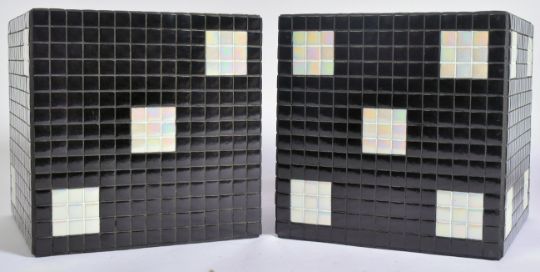Angus McBob (British) - Snake Eyes, 2022 - Two contemporary designer / artist studio art lamp tables / stools / coffee tables in the form of six sided dice. Each of iridescent white & glossy black 20mm ceramic tiles forming the cube dice; each measures approx. 37cm x 37cm x 37cm.