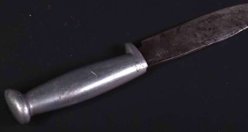 A WWII Second World War US United States trench fighting knife. The alloy hilt stamped  ' Tlemcen 1943 R.R. Zimmer ' indicating the serviceman was part of Operation Torch in the allied invasion of French North Africa.  The polished steel blade housed in a brown leather scabbard. Measures approx 27cm.