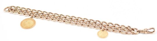A hallmarked 9ct gold double curb chain bracelet. The bracelet having a 1914 George V 22ct gold half sovereign with George V and St George to obverse. Alongside United States of America 1 dollar coin with Liberty head to obverse. Measures approx 13mm. Chain assay marked for Birmingham. Date letter 'v' for 1920. Stamped 375. Bracelet measures approx 20cm length. Total weight 41.6g.