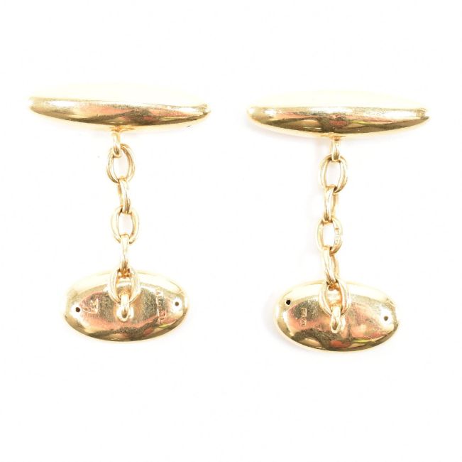 A pair of 18ct yellow gold cufflinks. The cufflinks having a lozenge & oval end united by cable link chain. Hallmarked for Birmingham, date letter rubbed. Total weight approx 6.5g. Measure approx 2.5cm.