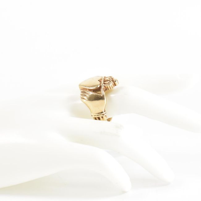 A hallmarked 9ct gold claddagh ring. The ring in the classic claddagh design depicting a crowned heart flanked by two hands on a straight band. Hallmarked for Sheffield 1999. Total weight approx 25.4g. Approx size Z.5.