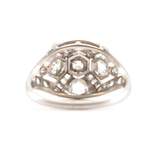 An Art Deco diamond bombe ring. The ring set with old and rose cut diamonds to a open work geometric bombe mount. Un marked tests indicate platinum. Weight 4.7g. Size N.