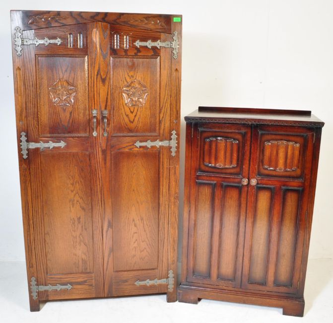 Jacobean revival oak bachelors wardrobe and similar single full size wardrobe, both in the manner of Old Charm / Jaycee Furniture. Carved panel doors to each with bracket plinth bases. Measures approx; 185cm x 127cm x 54cm.