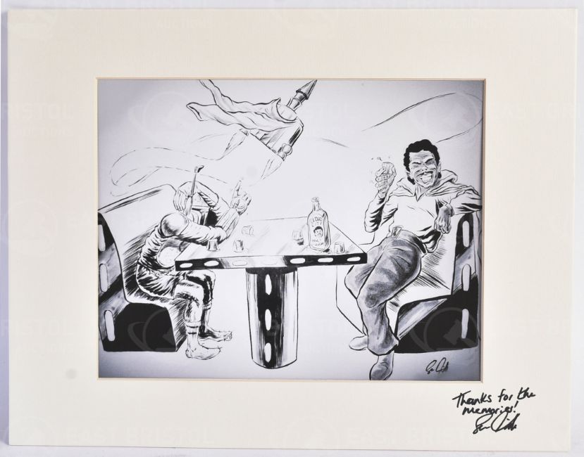 Estate of Jeremy Bulloch - Star Wars - Shane Kirshenblatt (artist) - an artwork print depicting Boba Fett and Lando Calrissian in Cloud City. Signed by the artist to the mount, and dedicated to Bulloch with 'Thanks for the memories!' Total size 28cm x 35cm.