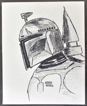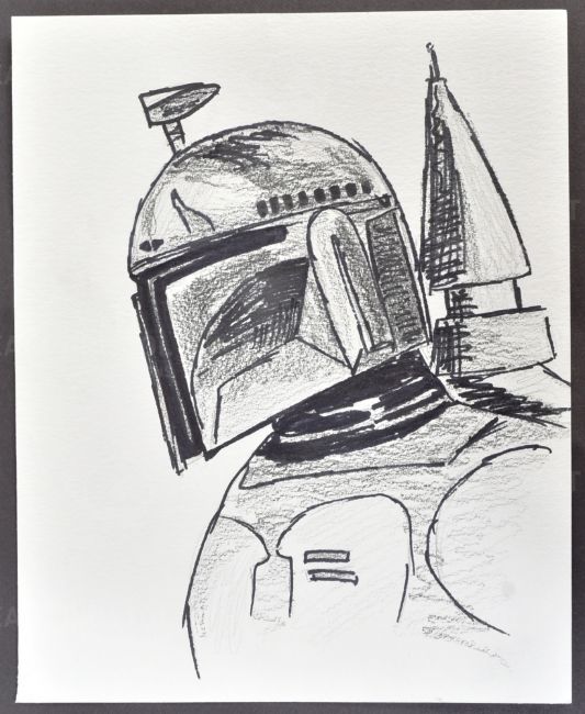 Estate of Jeremy Bulloch - Star Wars - Fan Art - Boba Fett - a fan art charcoal and ink study of Fett. Depicted in profile, with rocket pack visible. Signed to rear in pencil, dated 1991. Unknown artist. 8" x 10" approx.