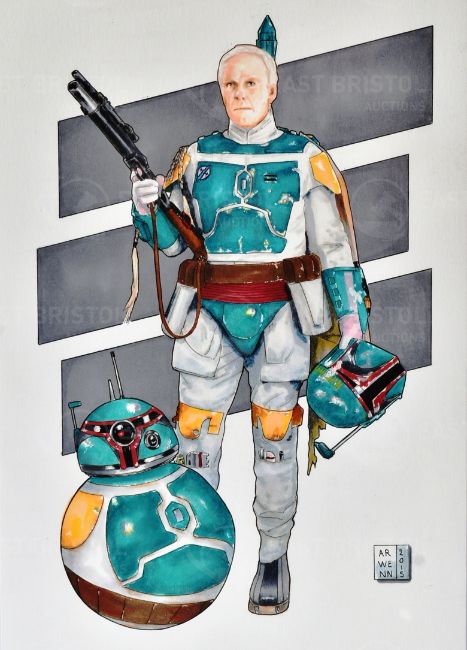 Estate of Jeremy Bulloch - Artwork - Arwenn (2015) - an ink and watercolour painting depicting Bulloch as Boba Fett in the franchise, alongside a 'Boba Fett' stylised BB8 droid. Signed to the corner by the artist, dated 2015. Unique item from Bulloch's estate. Framed. Total size 43cm x 33cm.