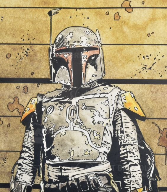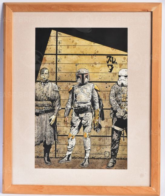Estate of Jeremy Bulloch - Star Wars - Tim Bradstreet (Official SW Artist) - a large format watercolour painting depicting Boba Fett in a line-up. Signed by the artist and dedicated 'To JB'. Framed and glazed. As displayed in Bulloch's home museum. Total size: 55cm x 45cm.