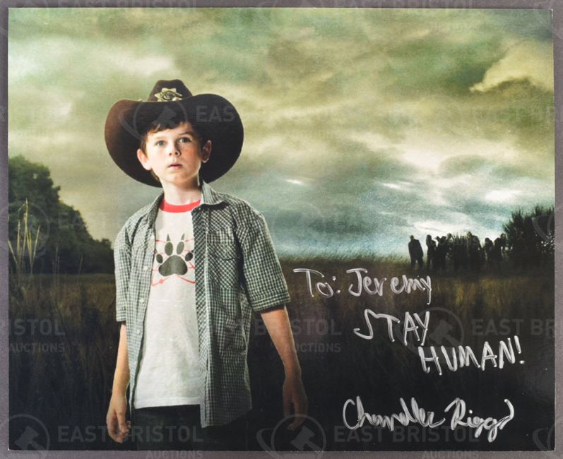 Estate of Jeremy Bulloch - The Walking Dead - Chandler Riggs (Carl) - autographed 8x10" photograph from the franchise, signed and dedicated 'To Jeremy - Stay Human!' in silver ink to a dark area of the image. Obtained personally by Bulloch.