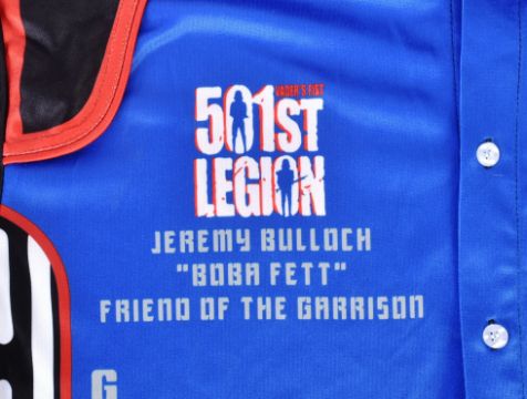 Estate of Jeremy Bulloch - Star Wars 501st Legion - Bulloch's personally presented and owned 501st Legion Jersey / Shirt. Printed with 'Jeremy Bulloch - Boba Fett - Friend Of The Garrison' to front and various 501st Insignia. Size L. Used, but generally in excellent original condition.
