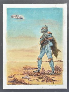 Estate of Jeremy Bulloch - Star Wars - Artwork - Unknown Artist 'Here Comes Trouble' - a mixed media painting on canvas depicting Boba Fett looking up to the Millennium Falcon. Signed and titled to the corner, dated 1997. Measures 40cm x 30cm.