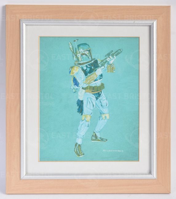 Estate of Jeremy Bulloch - Star Wars - Artwork - Sue Walmsley (artist) - a mixed media painting of Boba Fett from Return Of The Jedi. Painted on green card stock and signed by the artist to the corner. Framed and glazed. Total size: 38cm x 33cm.