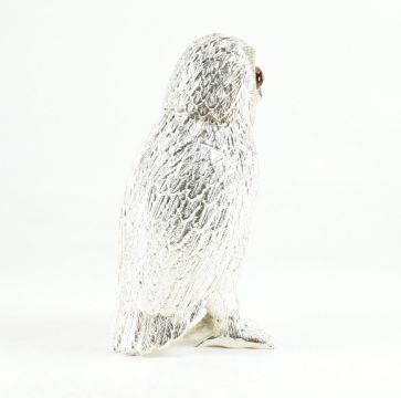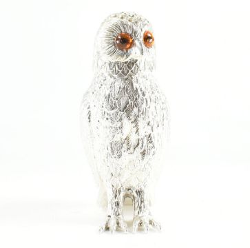 A silver plated owl sugar shaker. The sugar shaker / flour sifter in the form of a standing owl with orange stones set to the eyes. Total weight approx 858.3g. Measures approx 15cm.