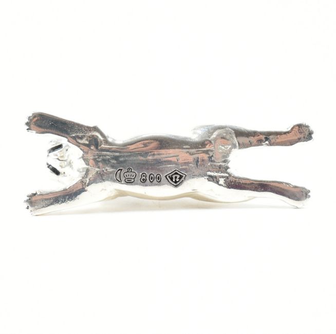 An 800 silver plated French bulldog figure. The French bulldog breed dog depicted laying on it's tummy with legs outstretched and yellow stones set to the eyes. Marked 800 to base. Total weight approx 65.7g. Measures approx 8.5cm.