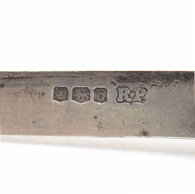 An assortment of silver and mother of pearl items. The lot to include four silver thimbles. The first thimble having a beaded flower pattern to the outside (marked 925). The second having a floral design to the lower half and beaded pattern to the top (hallmarked Birmingham 1923). The third thimble having a criss-cross pattern to the outside (marked sterling). The fourth having a mottled design. (unmarked however tests indicate silver). Together with a fruit knife. The knife having a mother of pearl handle and silver blade (hallmarked Sheffield, 1919). A silver plated lidded pot. The pot having a geometric floral pattern to the lid and a sterling silver place name holder. Total weight approx 90g. Largest measures approx 8cm. Smallest approx 2cm.