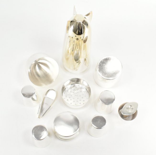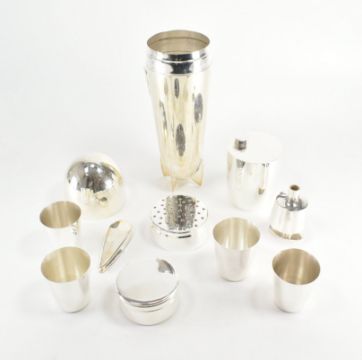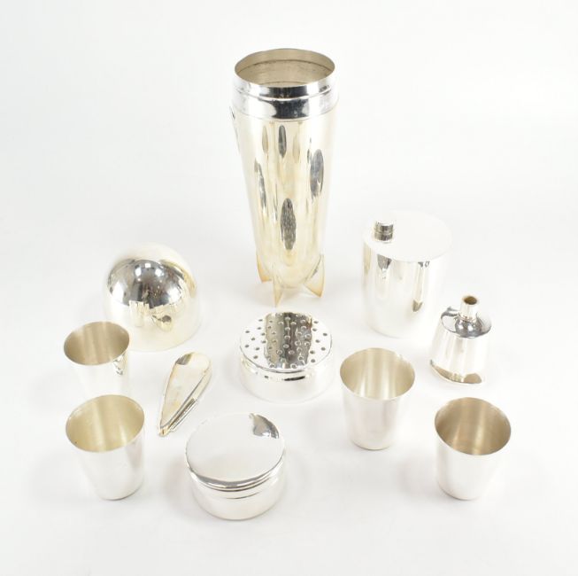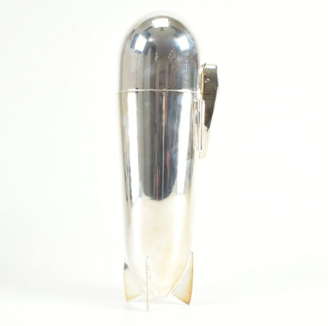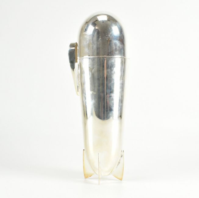 A silver plated zeppelin cocktail shaker. The cocktail maker in the form of an airship having many various components such as measures & strainer. Total weight approx 626.4g. Measures approx 25cm.